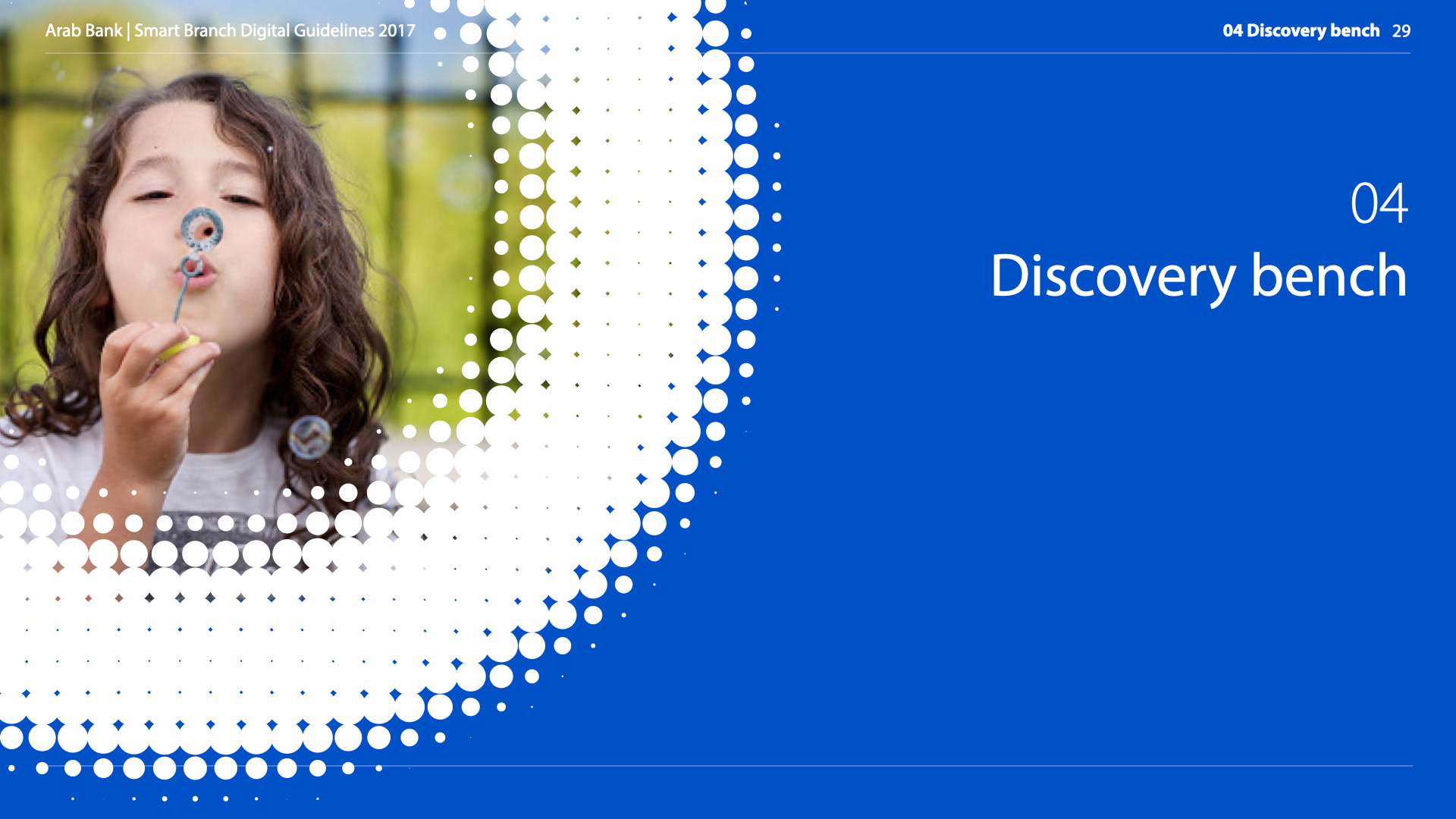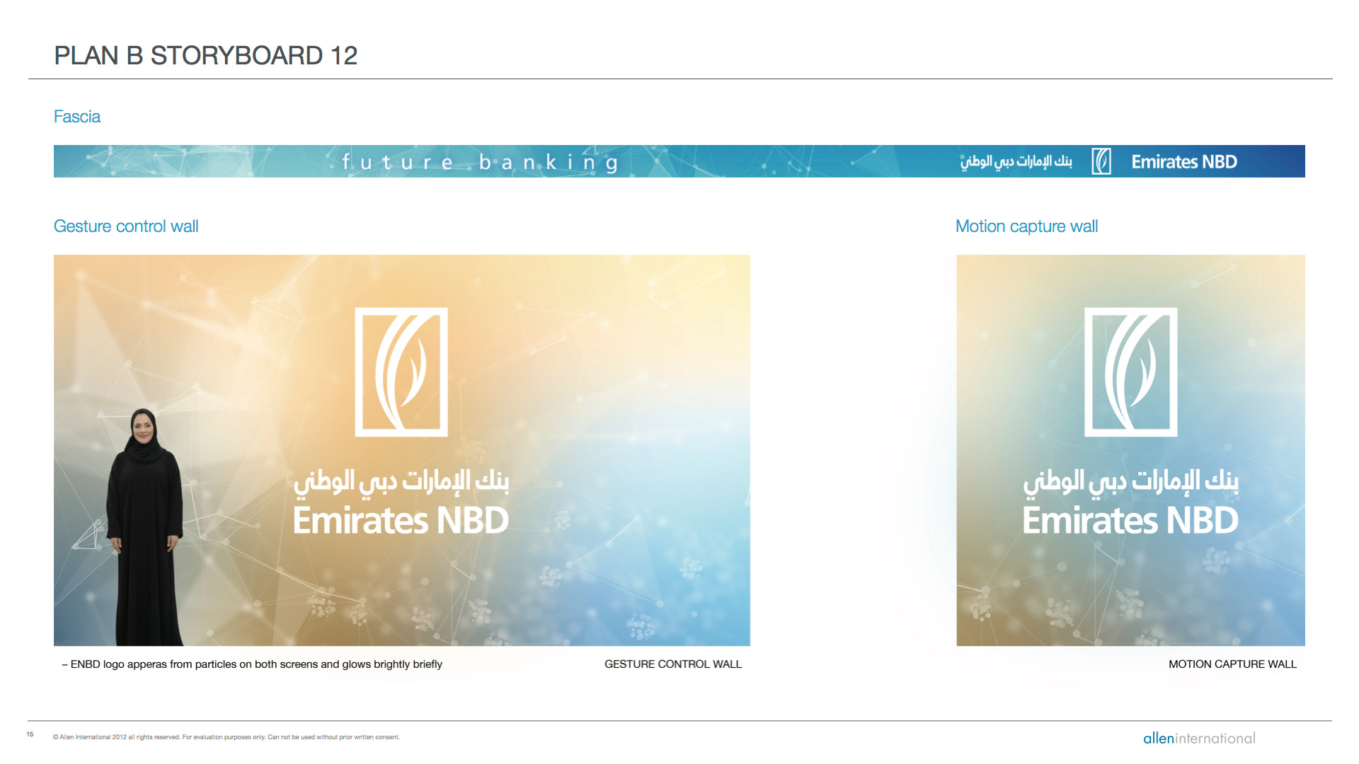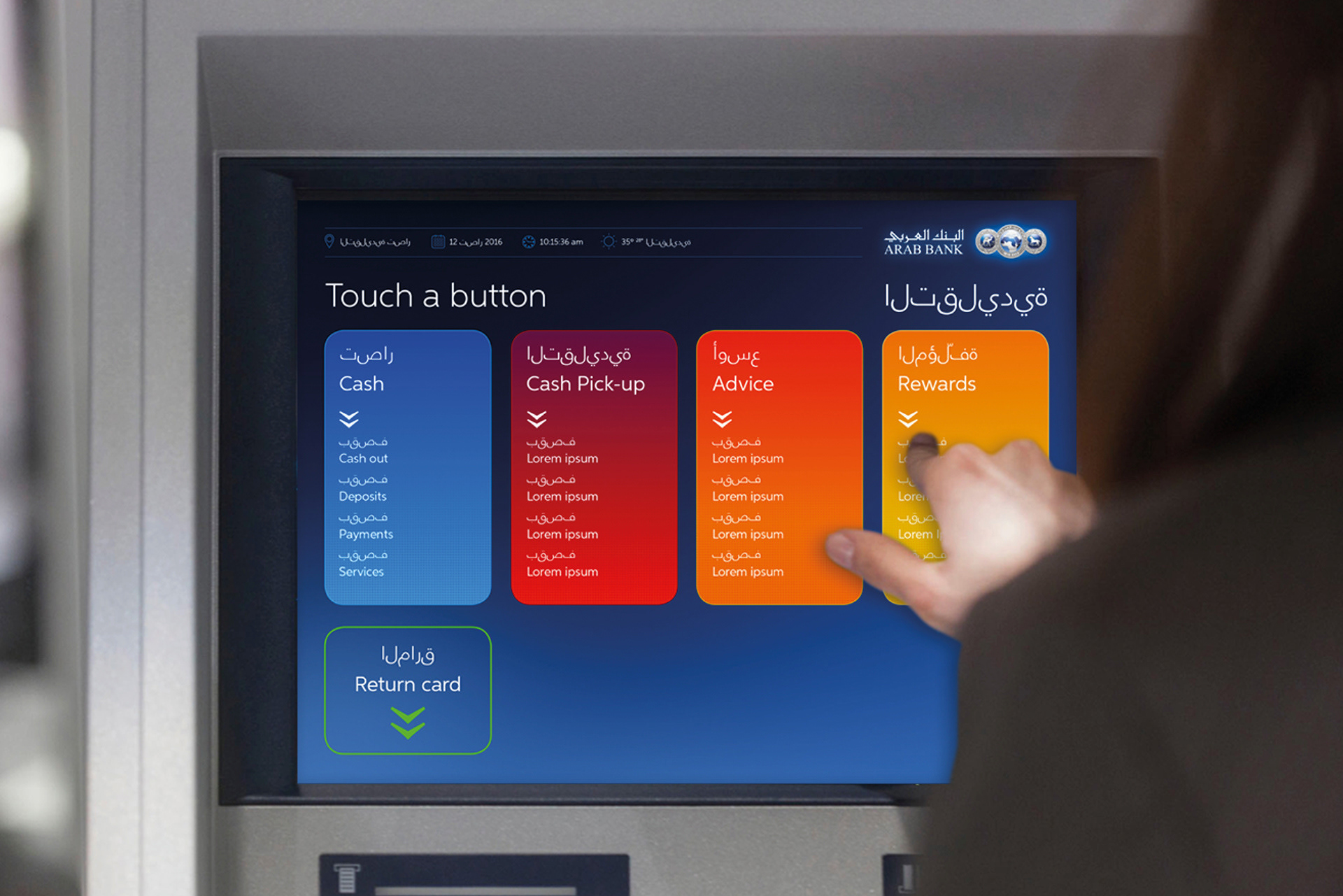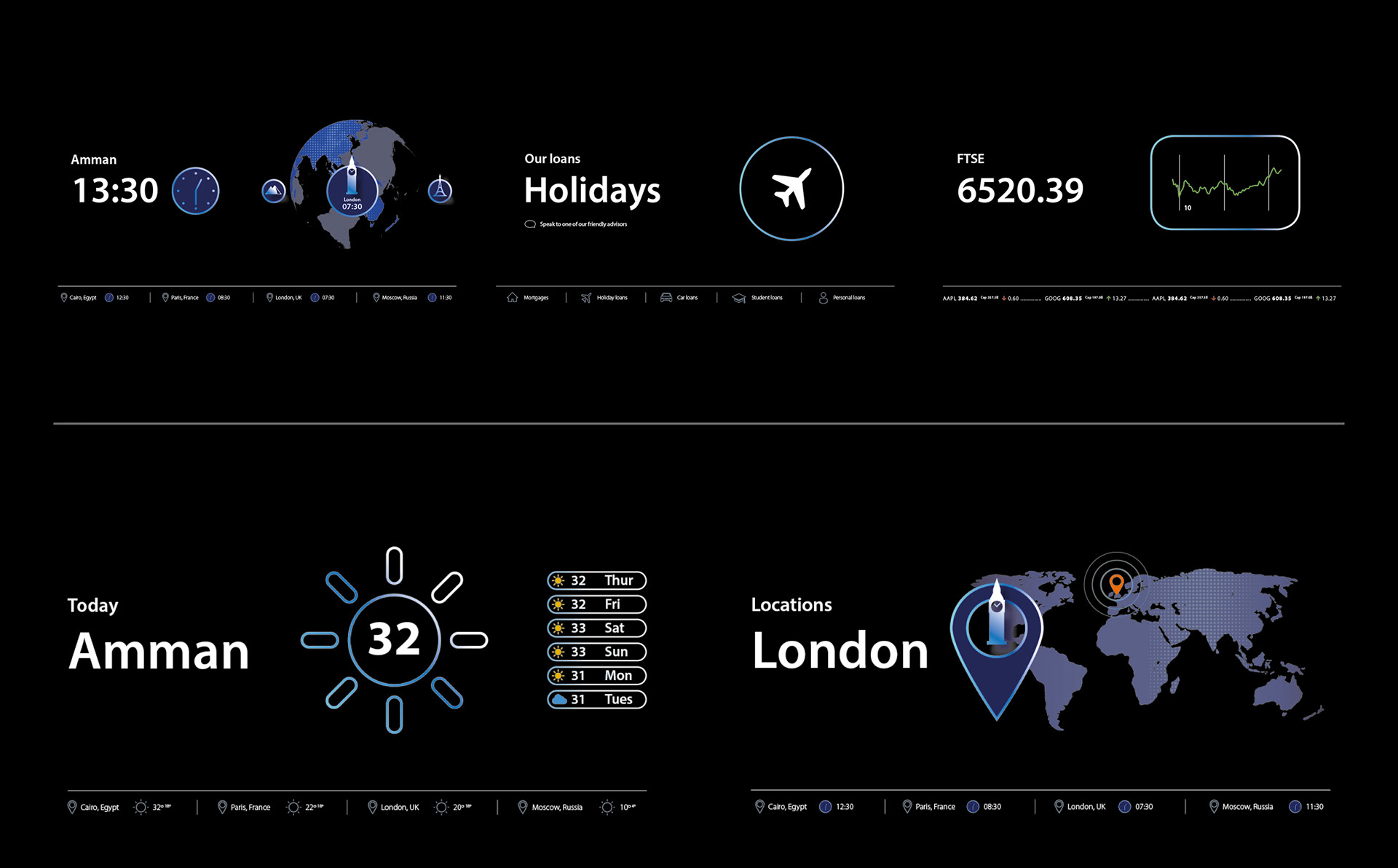 A brand refresh for Arab Bank's digital branch concept in Jordan, designed at Allen International. As lead designer, I created the look and feel for the innovative mirror screen surfaces – featuring controlled, contemporary infographic animations – that provided a stunning centrepiece for showcase branches. The brand refresh included the introduction of an expanded brand language suitable for a consistent user interface across devices and ATMs, branch signage, and design guidelines created in Keynote.