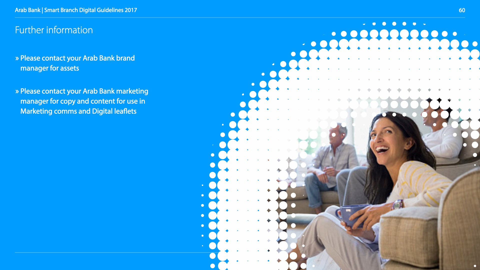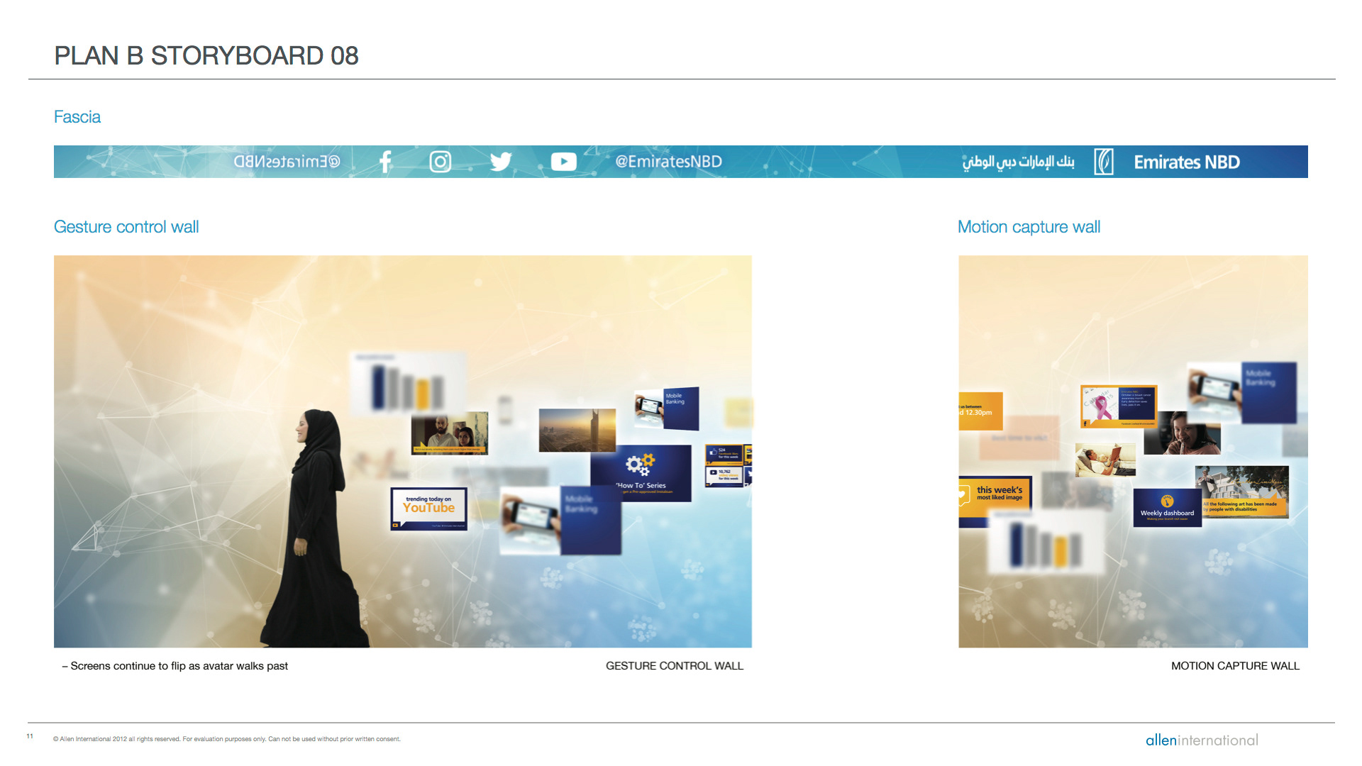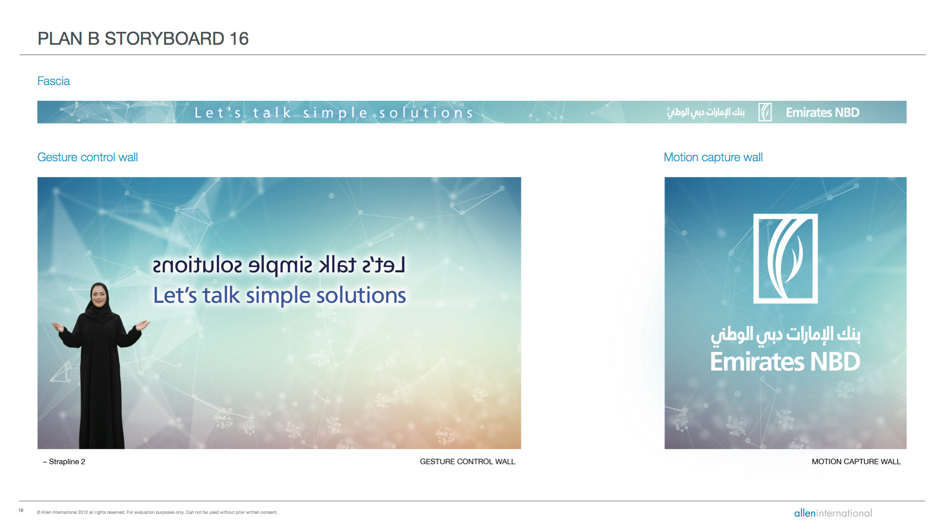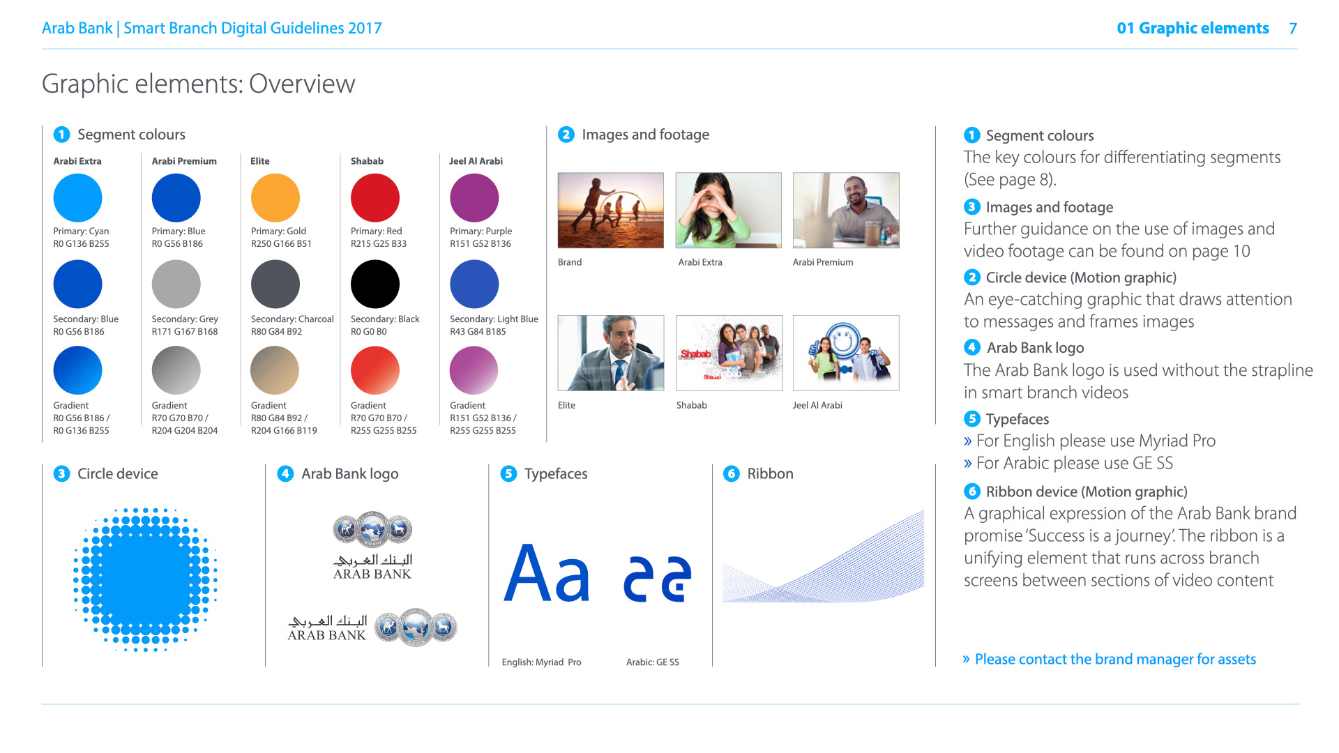 A brand refresh for Arab Bank's digital branch concept in Jordan, designed at Allen International. As lead designer, I created the look and feel for the innovative mirror screen surfaces – featuring controlled, contemporary infographic animations – that provided a stunning centrepiece for showcase branches. The brand refresh included the introduction of an expanded brand language suitable for a consistent user interface across devices and ATMs, branch signage, and design guidelines created in Keynote.