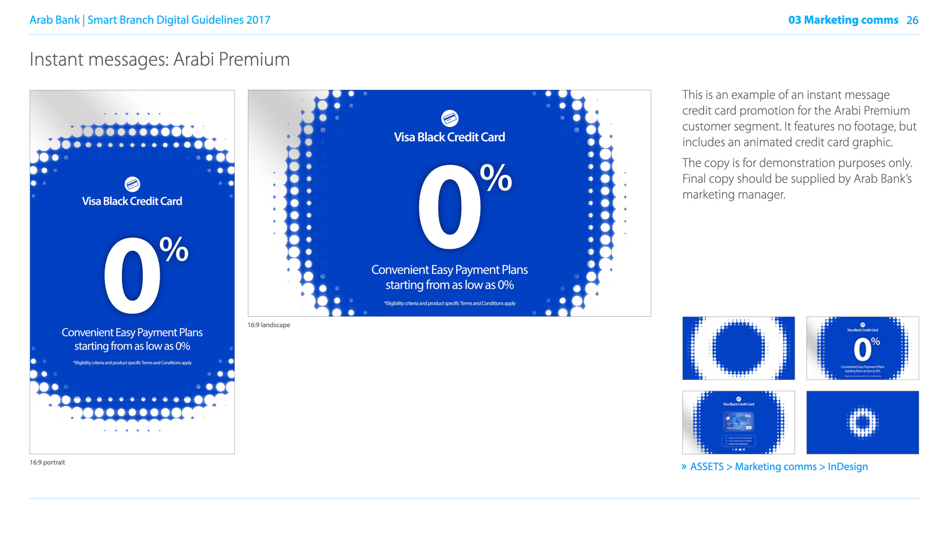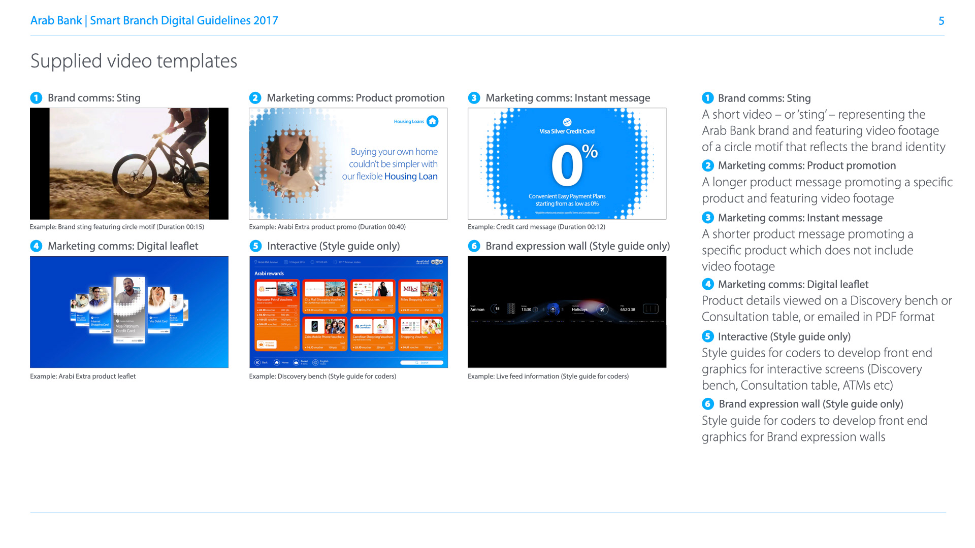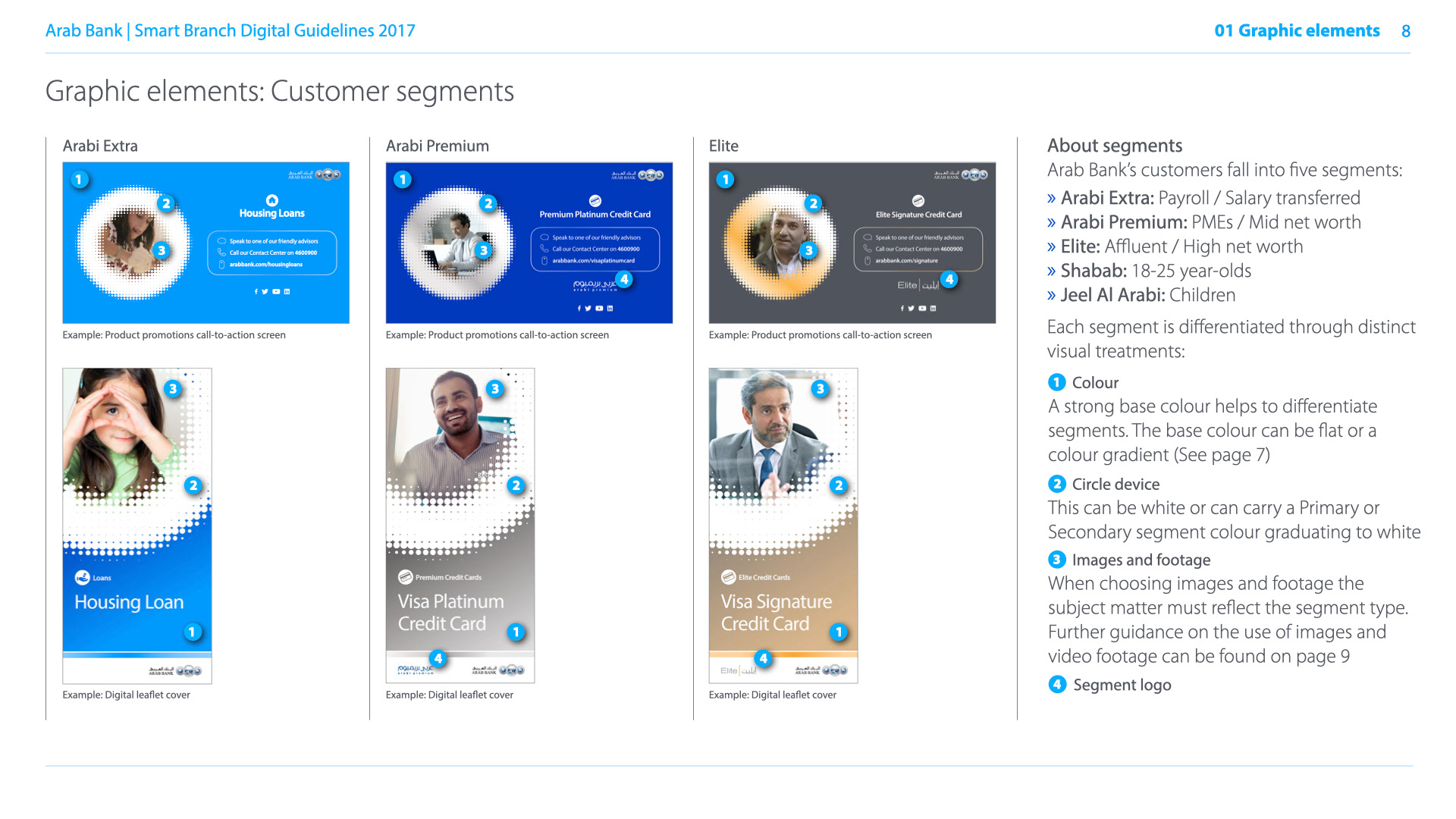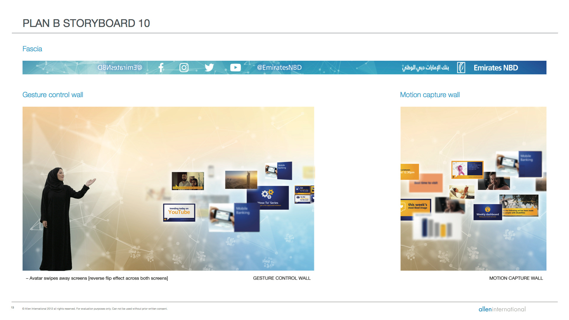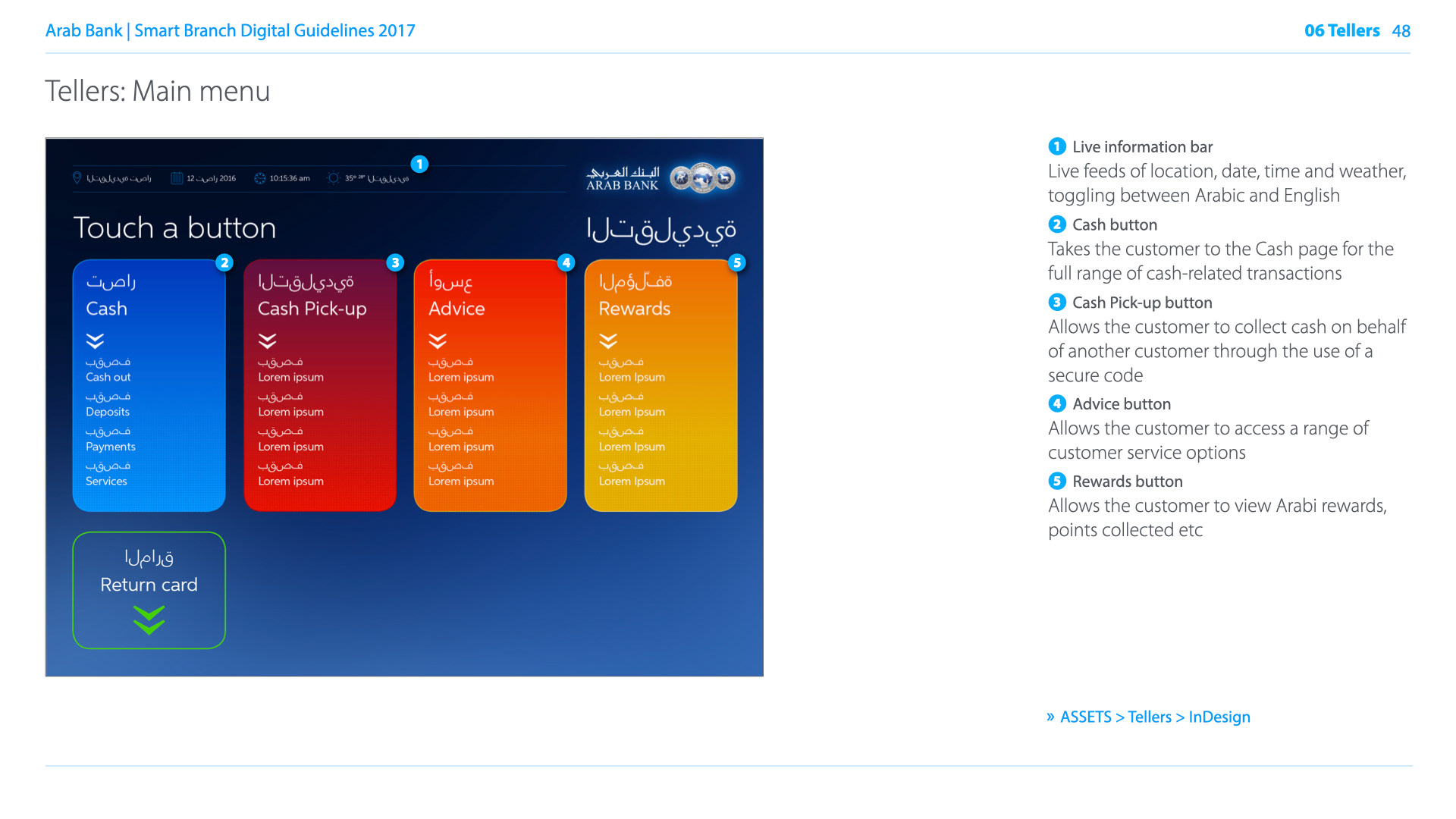 A brand refresh for Arab Bank's digital branch concept in Jordan, designed at Allen International. As lead designer, I created the look and feel for the innovative mirror screen surfaces – featuring controlled, contemporary infographic animations – that provided a stunning centrepiece for showcase branches. The brand refresh included the introduction of an expanded brand language suitable for a consistent user interface across devices and ATMs, branch signage, and design guidelines created in Keynote.
