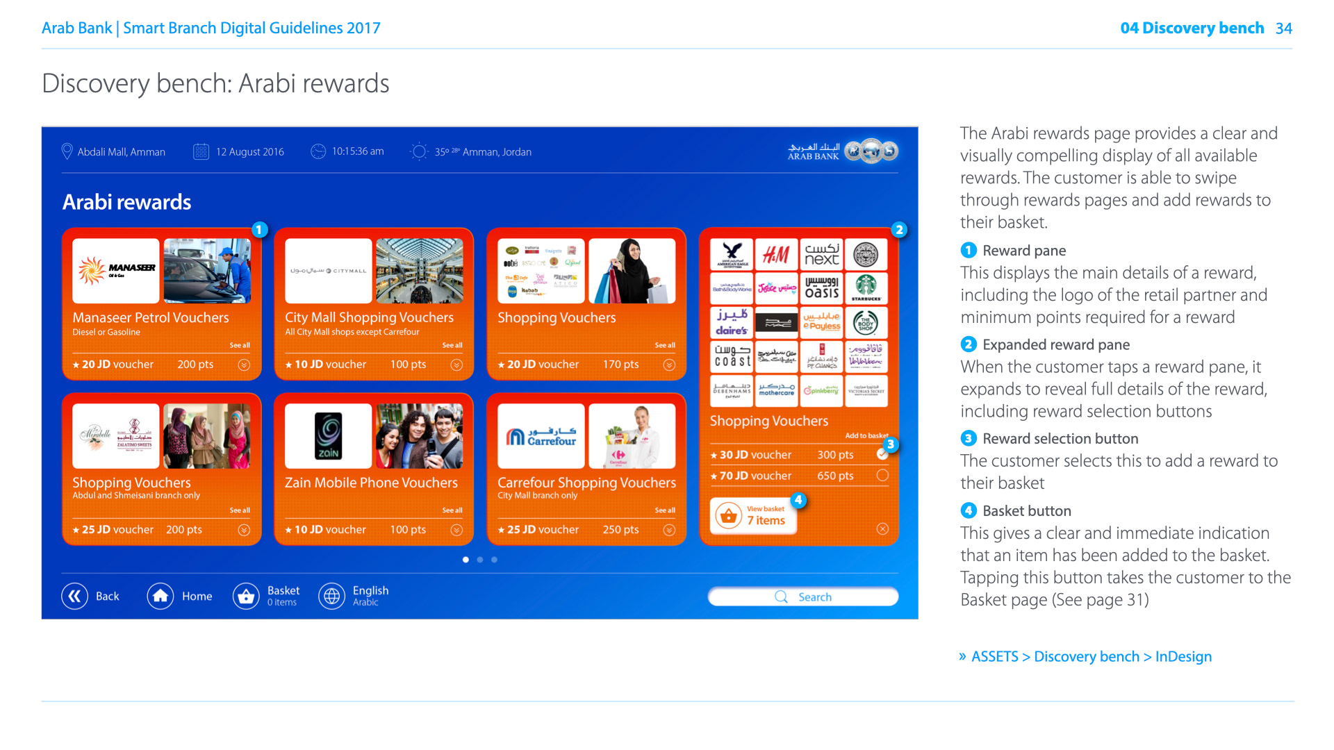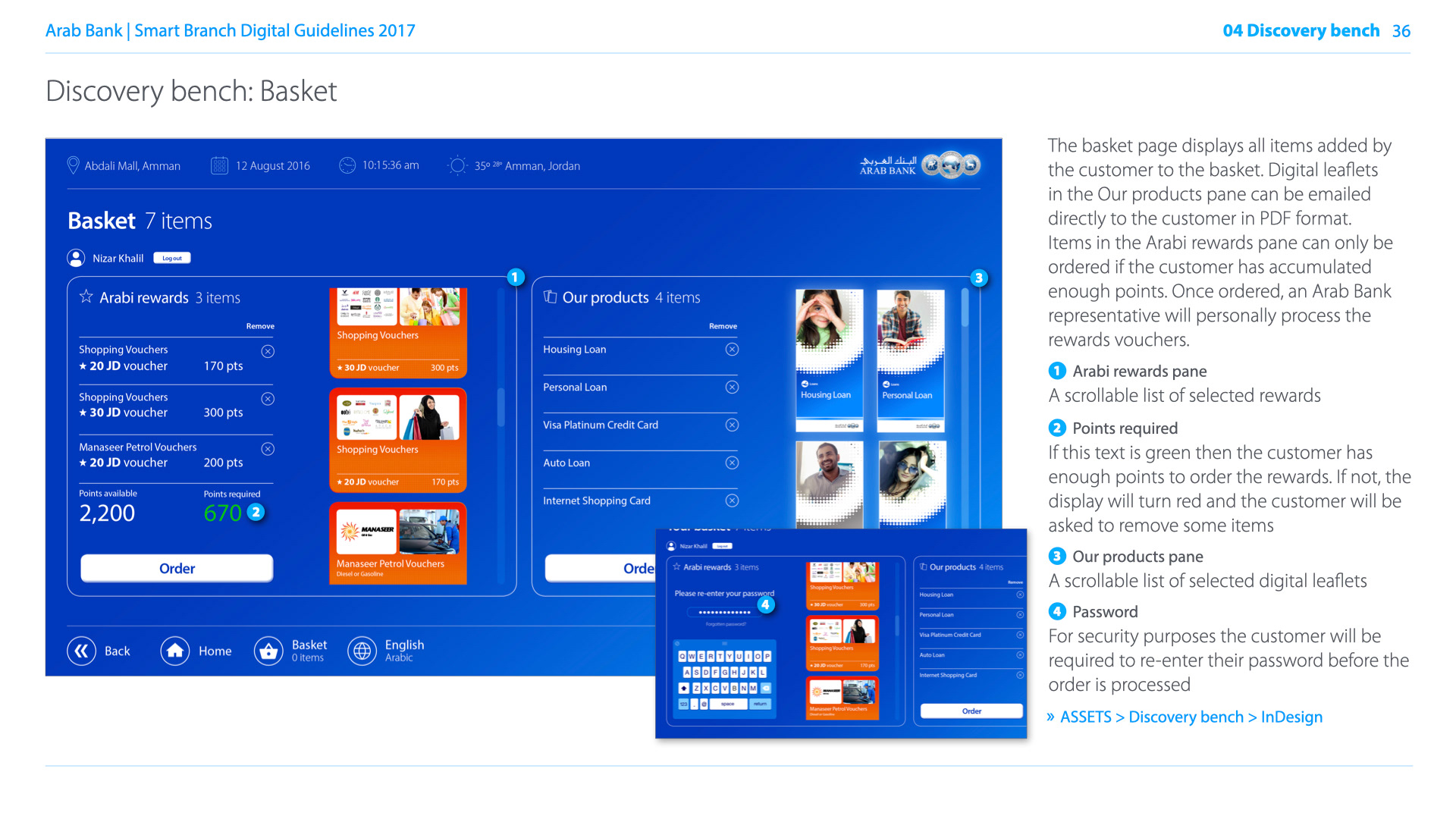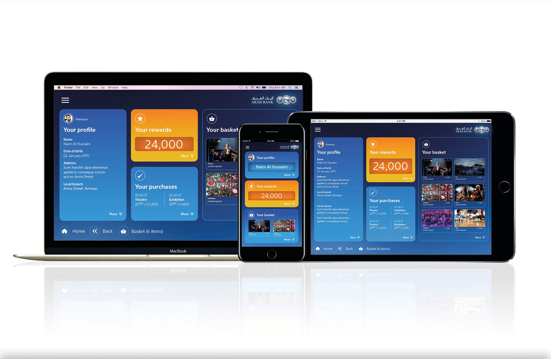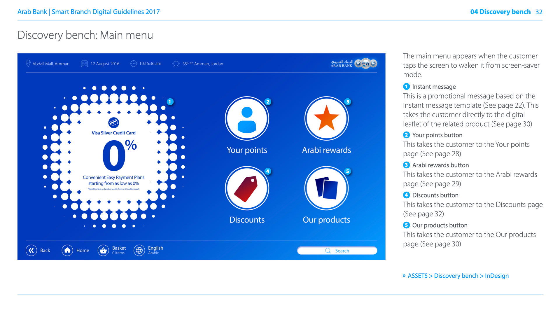 A brand refresh for Arab Bank's digital branch concept in Jordan, designed at Allen International. As lead designer, I created the look and feel for the innovative mirror screen surfaces – featuring controlled, contemporary infographic animations – that provided a stunning centrepiece for showcase branches. The brand refresh included the introduction of an expanded brand language suitable for a consistent user interface across devices and ATMs, branch signage, and design guidelines created in Keynote.