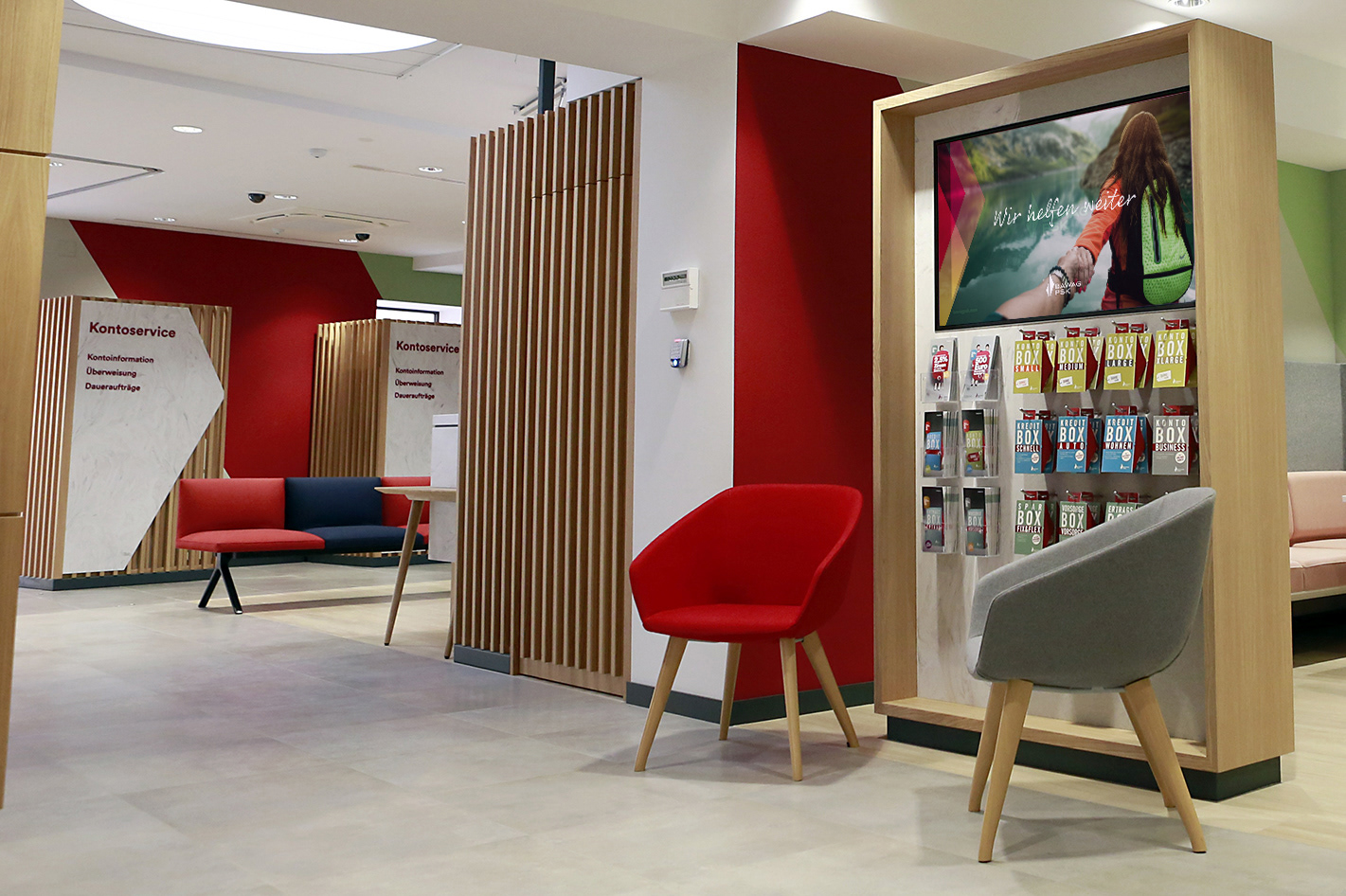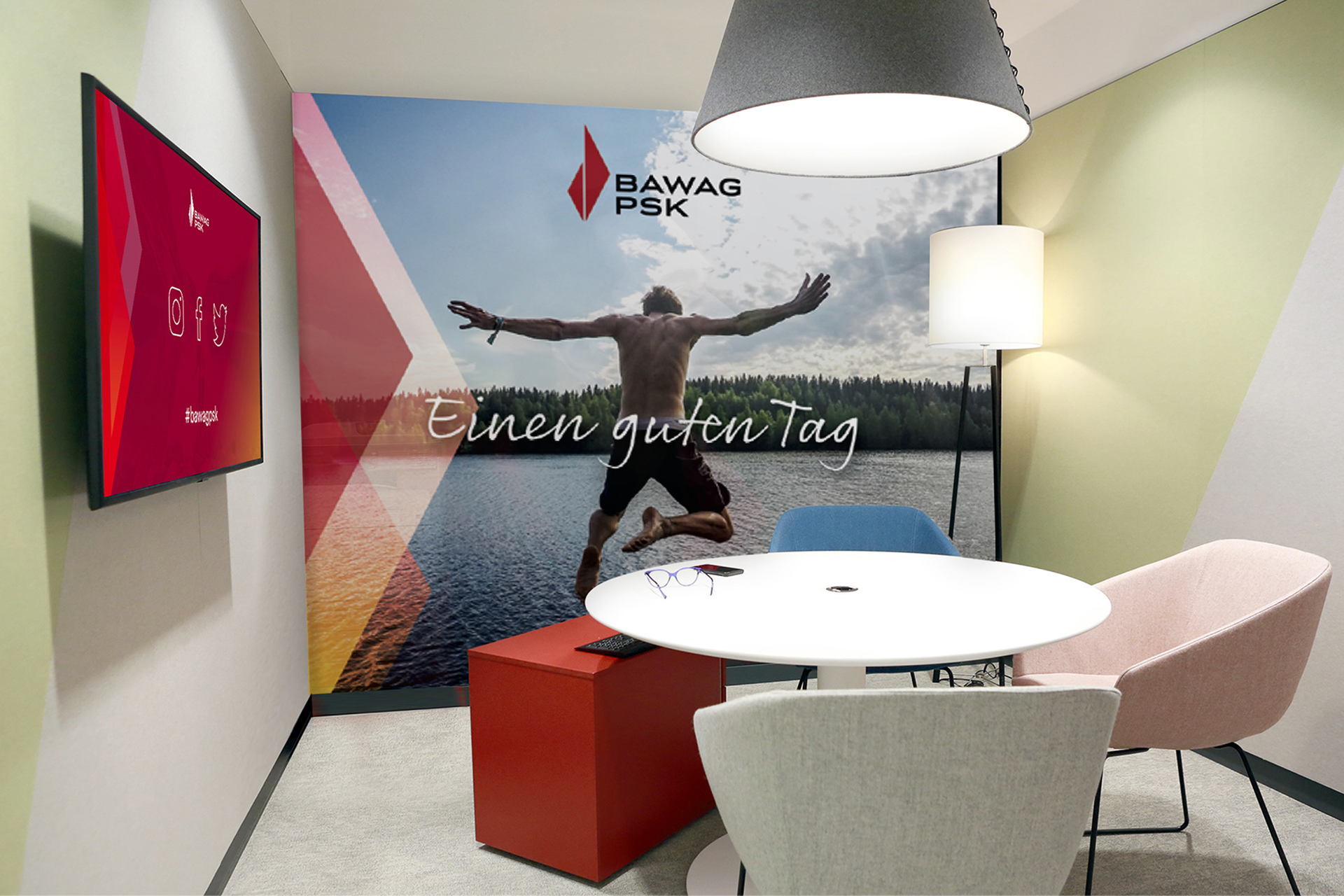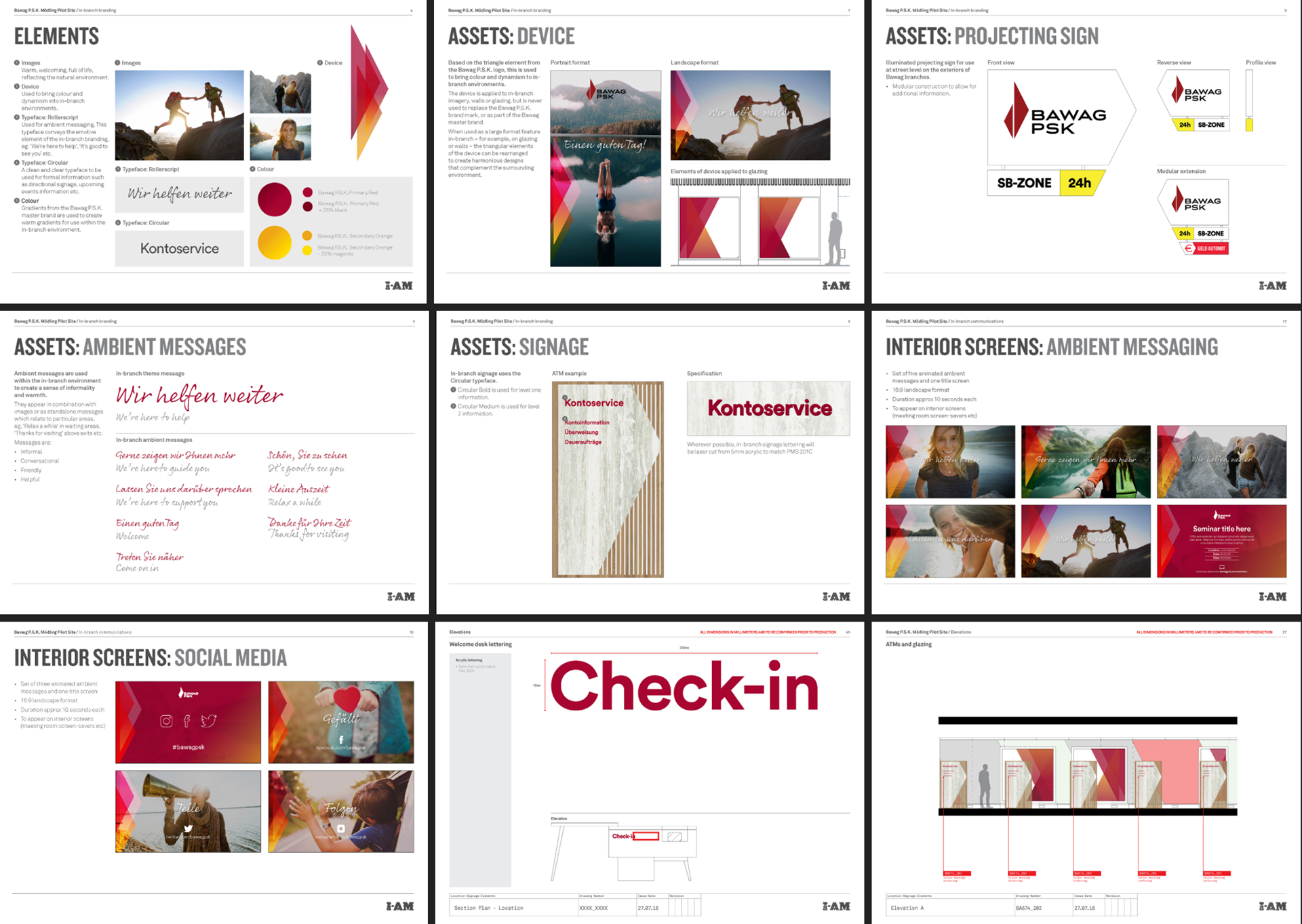 Bawag Bank required a new graphical treatment for their showcase branch in Mödling that reflected its Austrian heritage, and would also provide a reassuring and welcoming environment for customers. As lead designer, I created a look and feel that drew on the natural surroundings of the nearby Austrian landscape and the people that explored it. I adapted the bank's sharp and angular red 'sail' motif to become an anchor shape for in-branch signage, and softened it to become a layered, translucent super graphic for use with privacy screens and animated digital screen motifs. I also created a set of guidelines for roll-out across other branches.