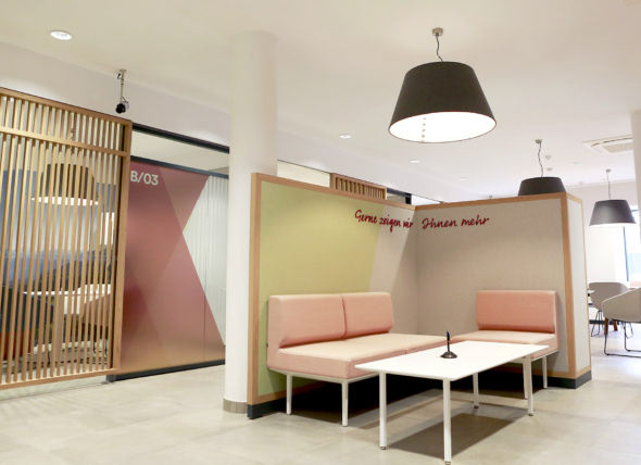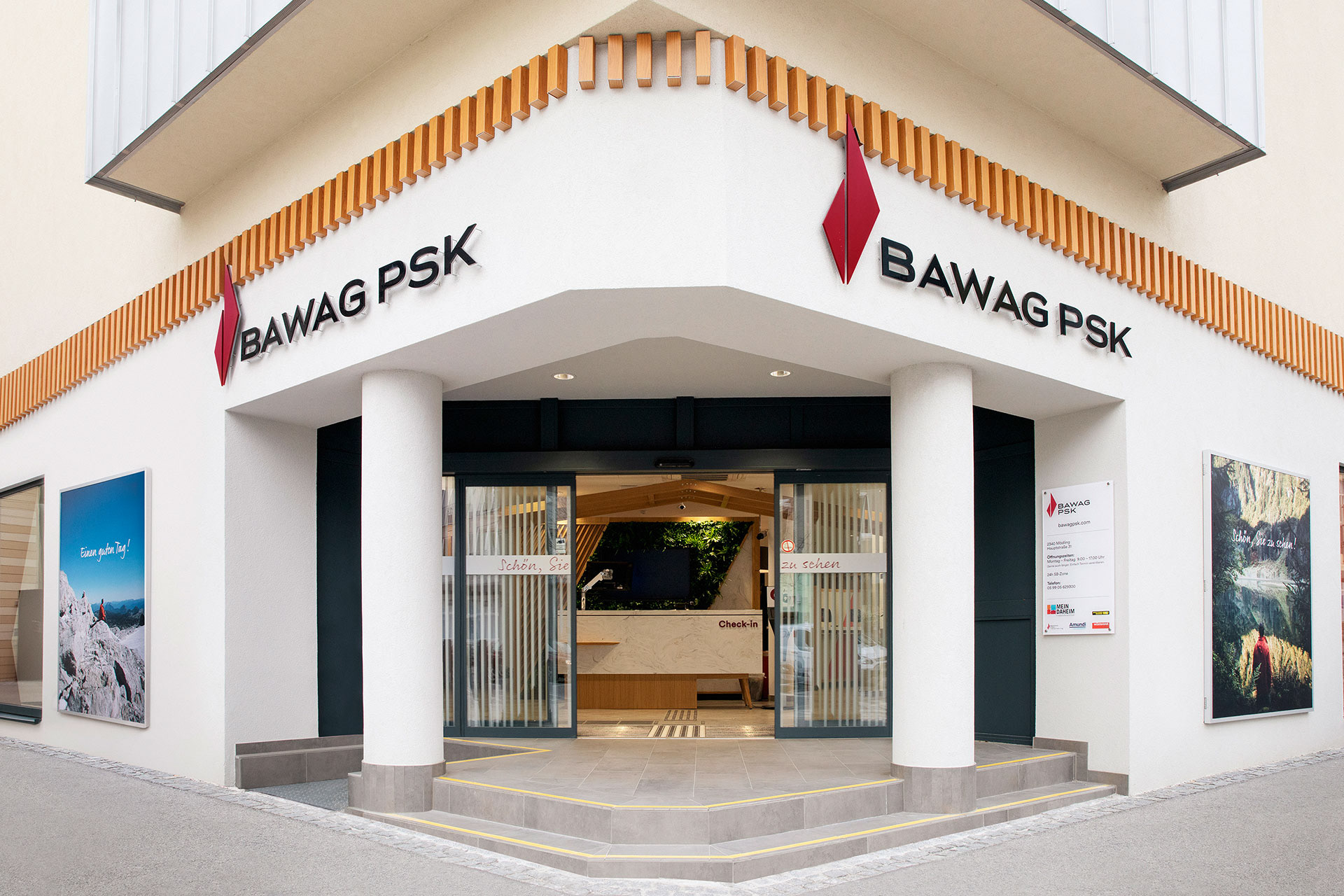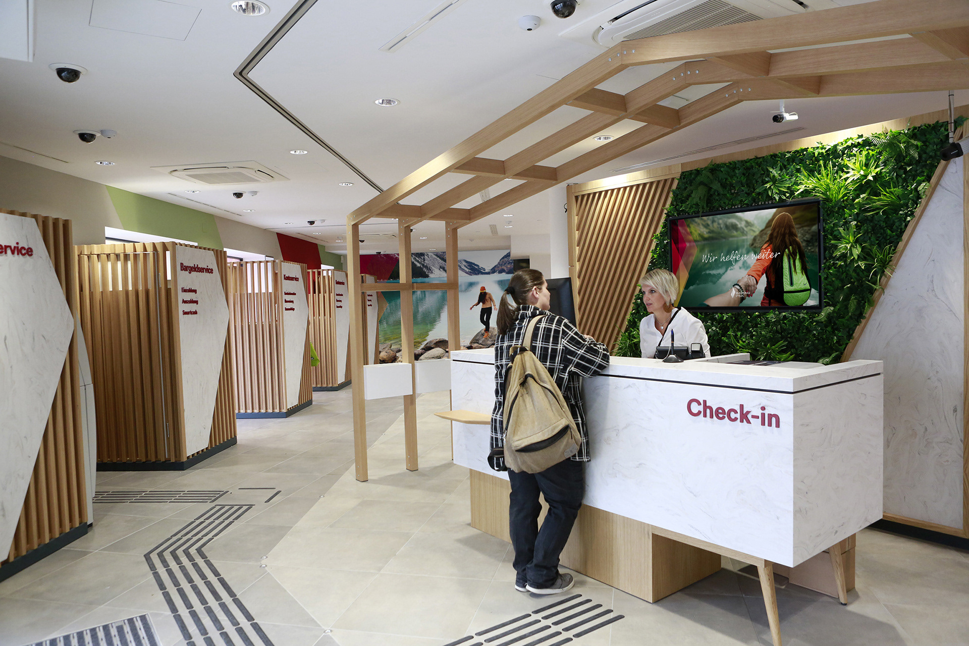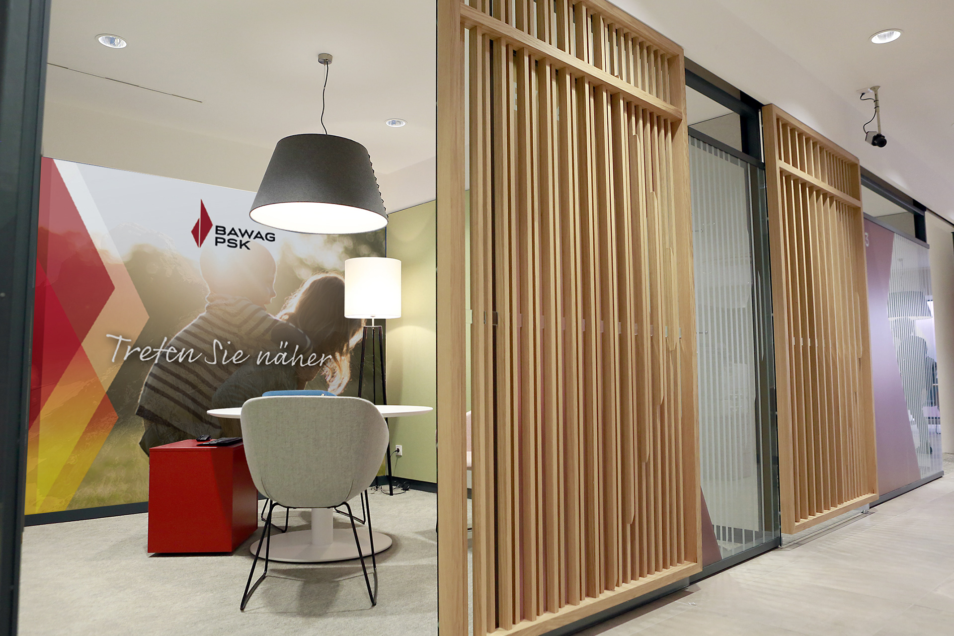 Bawag Bank required a new graphical treatment for their showcase branch in Mödling that reflected its Austrian heritage, and would also provide a reassuring and welcoming environment for customers. As lead designer, I created a look and feel that drew on the natural surroundings of the nearby Austrian landscape and the people that explored it. I adapted the bank's sharp and angular red 'sail' motif to become an anchor shape for in-branch signage, and softened it to become a layered, translucent super graphic for use with privacy screens and animated digital screen motifs. I also created a set of guidelines for roll-out across other branches.