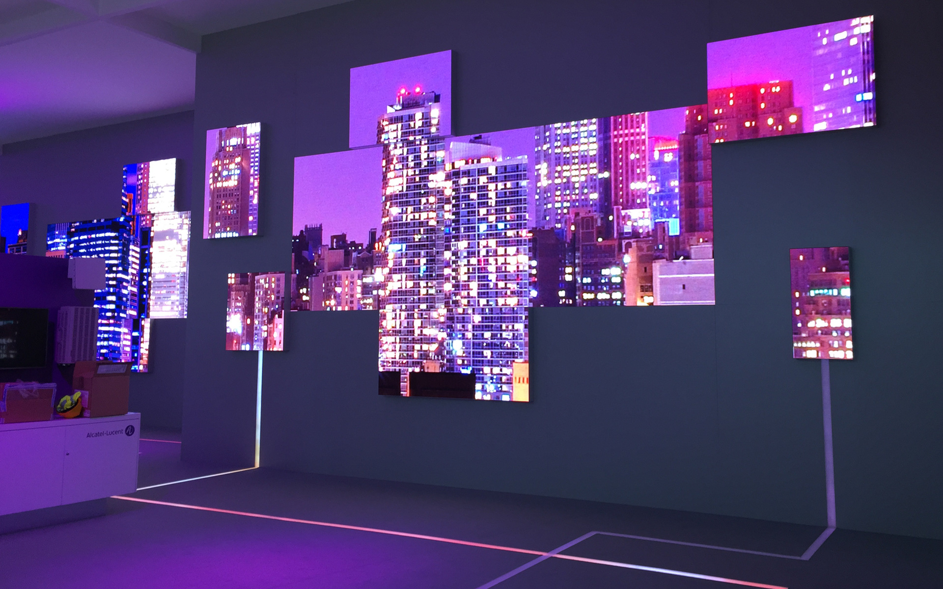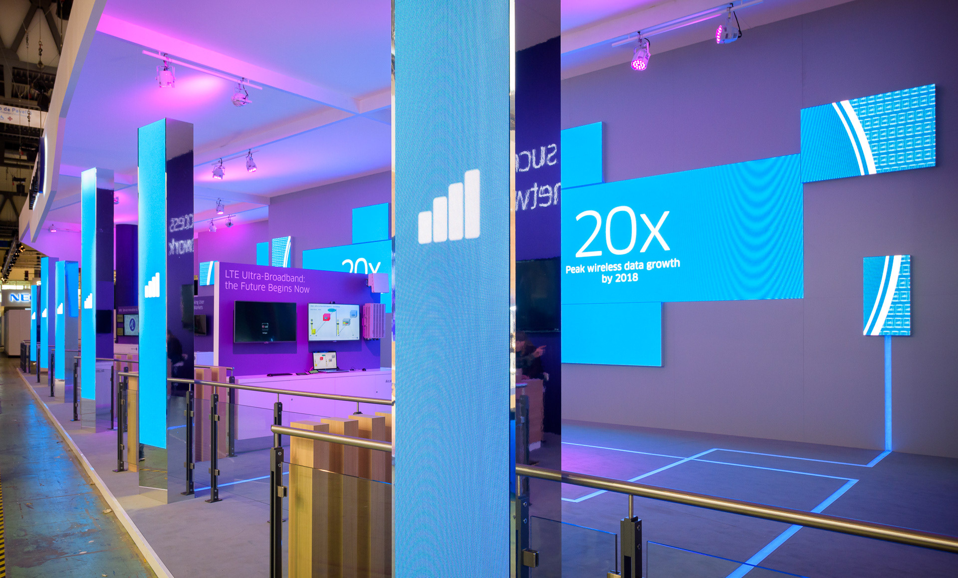 Working with the event agency Shelton Fleming, I created and art directed the graphic look and feel and video content for Alcatel Lucent's presence at MWC. Working closely with a multimedia contractor and animator, I devised a multi-screen layout incorporating LED pillars at the front of the stand, with inlaid LED tape connecting the pillars to the rear wall screen montage which was the main feature of the stand. The video content made full use of the versatile screen domain, transitioning between focused messaging in zoned areas to grandiose animated sweeps that took in the entire stand from edge to edge and front to back.