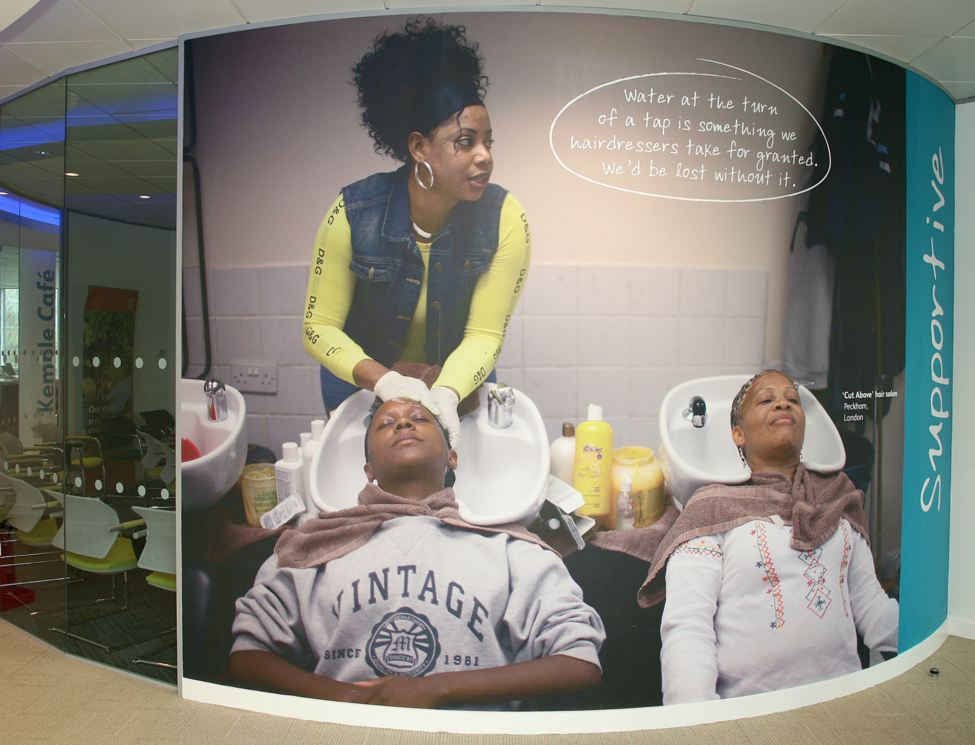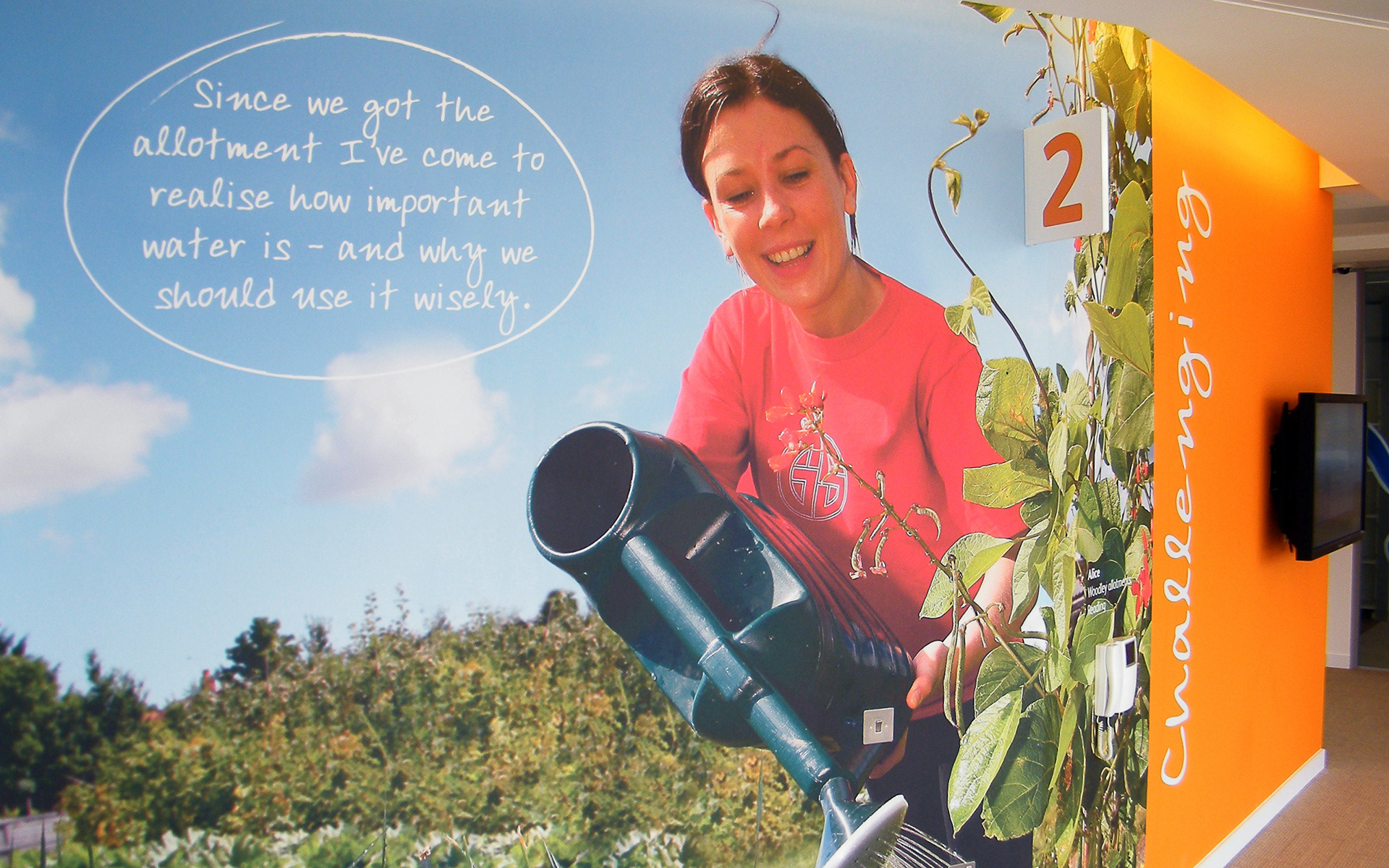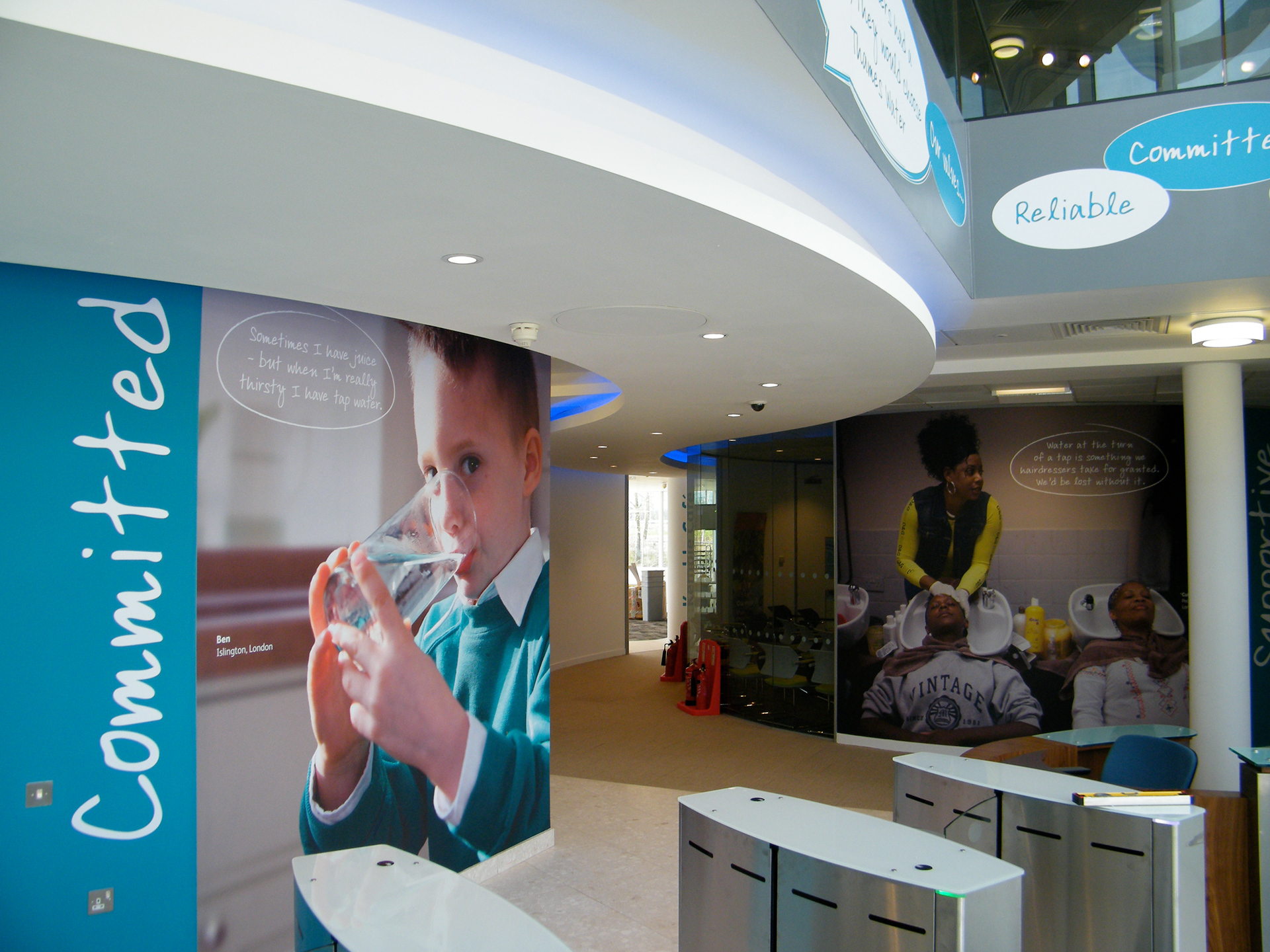 When Thames Water opened their Kemble Court Operations Management Centre in Reading, they wanted to bring their glass and concrete building to life. Bearing in mind that staff from several offices were being brought together at a business centre a long way from the people they were serving, we recommended a treatment that would focus on the customer. Large-scale photographs of customers using water in their day-to-day lives, be it for business or pleasure, served to remind employees of the people they were serving. Quotes from customers, using fresh, everyday language, punctuated the space throughout the four floors of Kemble Court. Messaging reinforcing brand values and operational excellence accompanied the images and quotes, embedding Thames Water’s customer-focused ethos into the fabric of the environment.
