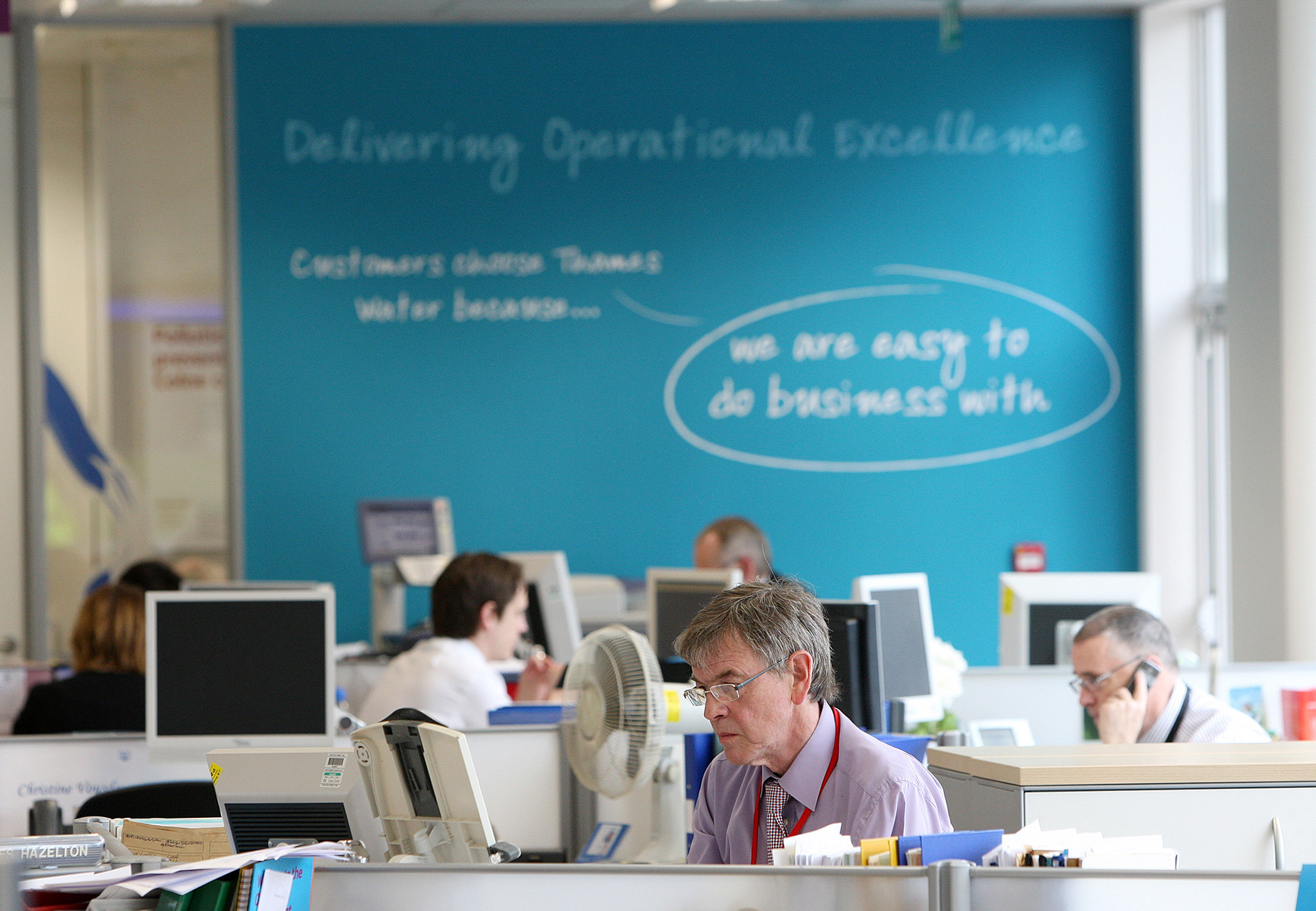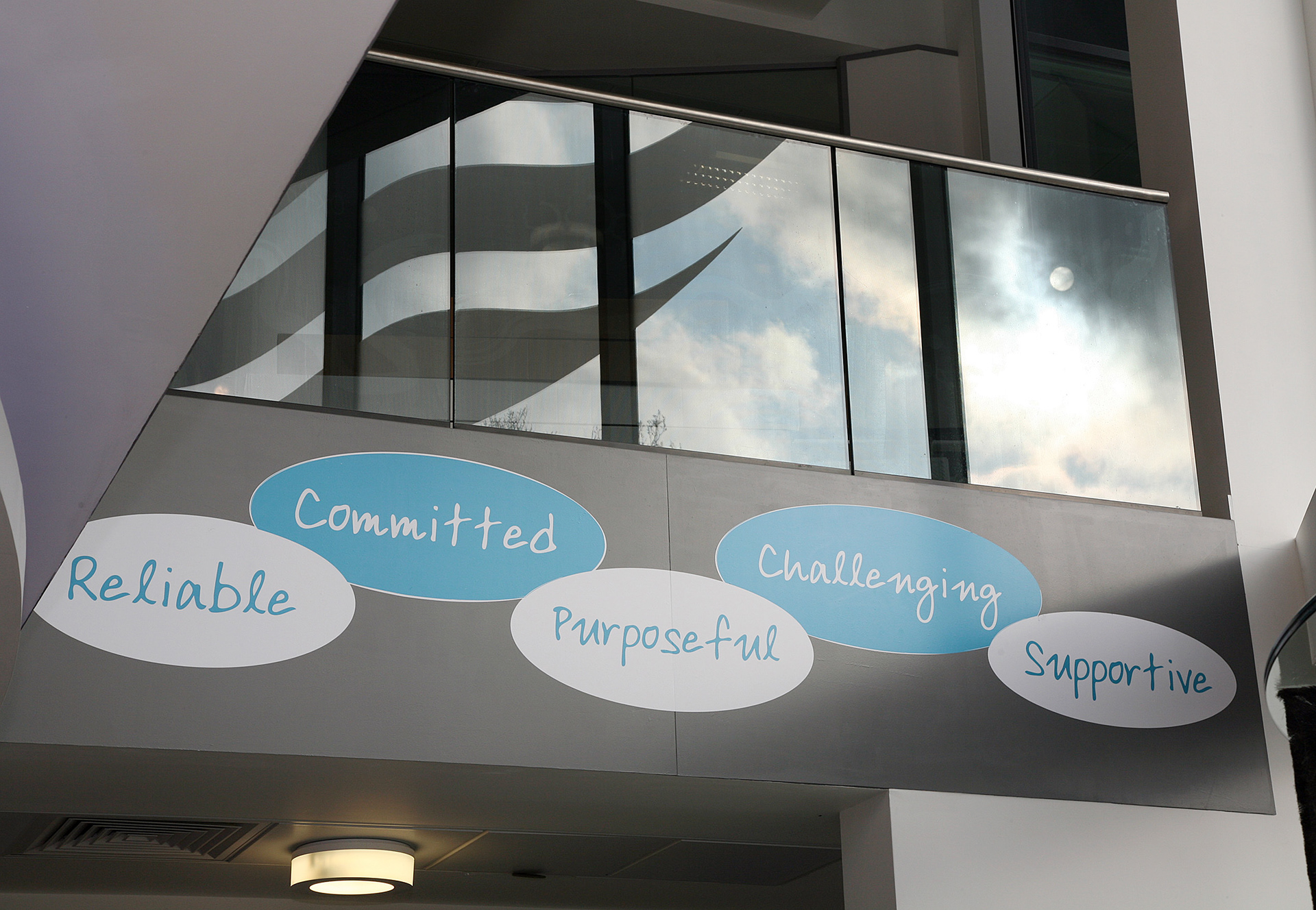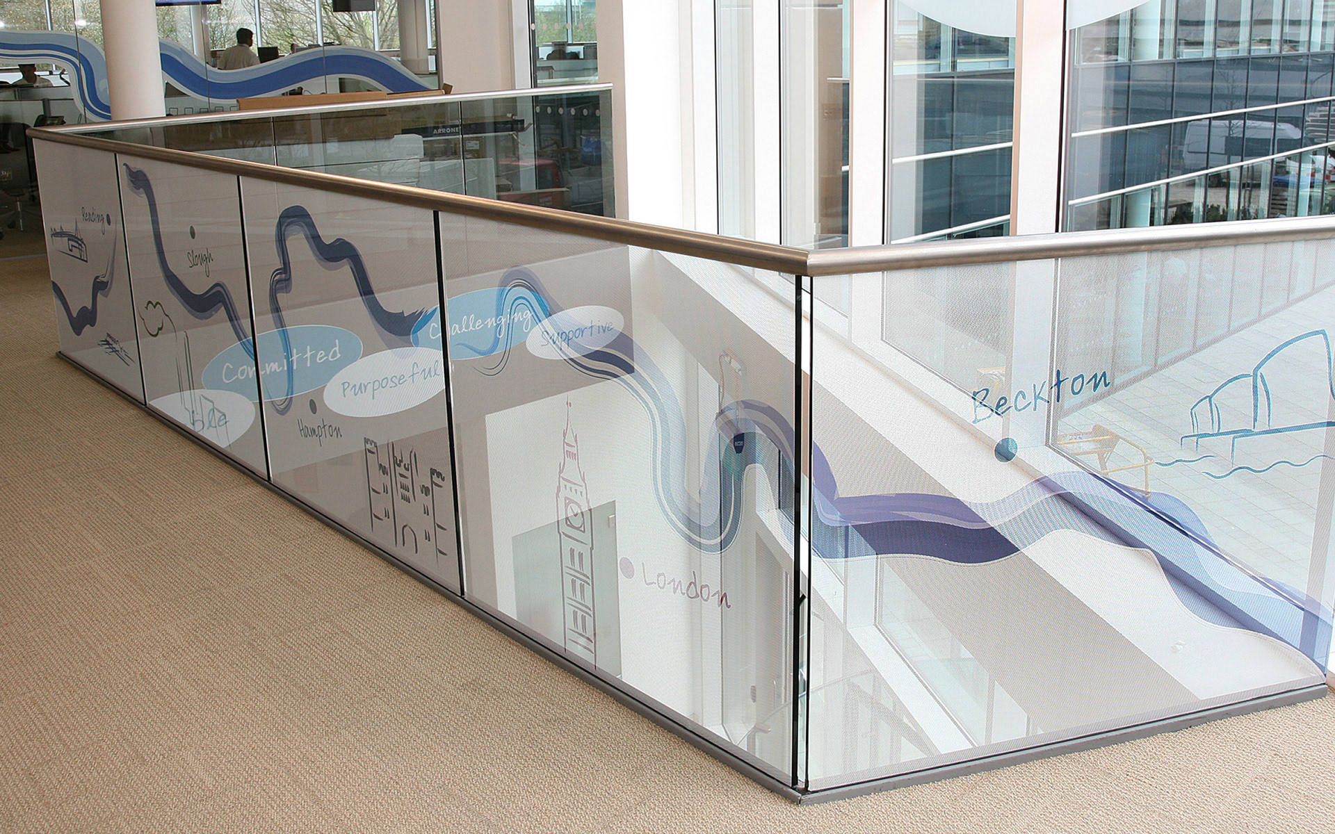 When Thames Water opened their Kemble Court Operations Management Centre in Reading, they wanted to bring their glass and concrete building to life. Bearing in mind that staff from several offices were being brought together at a business centre a long way from the people they were serving, we recommended a treatment that would focus on the customer. Large-scale photographs of customers using water in their day-to-day lives, be it for business or pleasure, served to remind employees of the people they were serving. Quotes from customers, using fresh, everyday language, punctuated the space throughout the four floors of Kemble Court. Messaging reinforcing brand values and operational excellence accompanied the images and quotes, embedding Thames Water’s customer-focused ethos into the fabric of the environment.