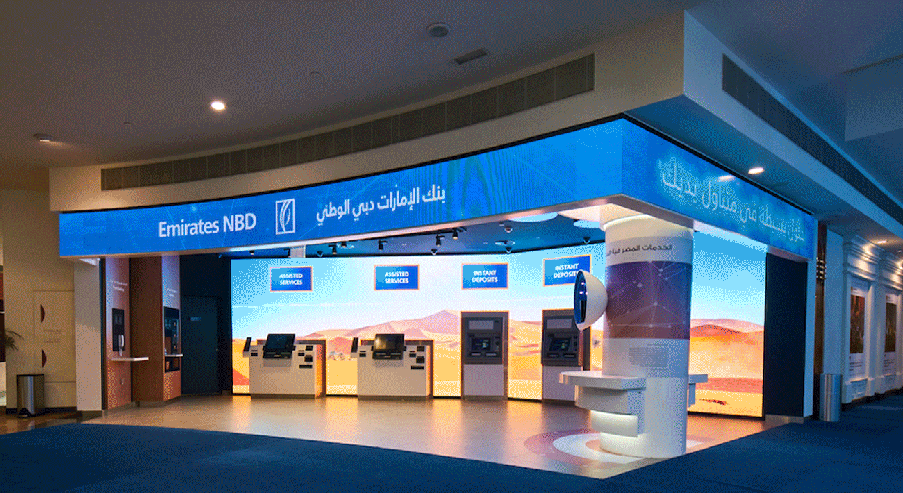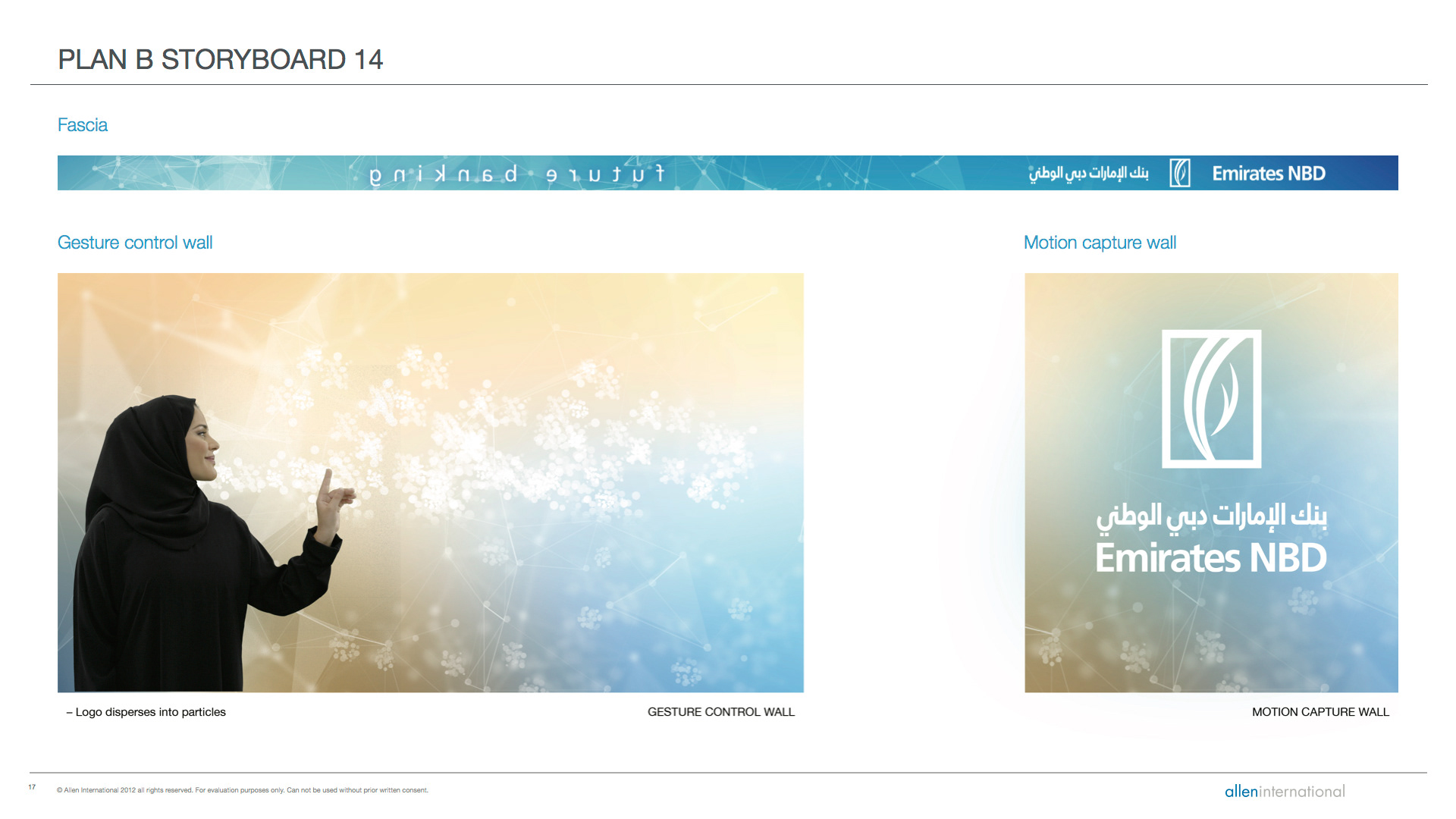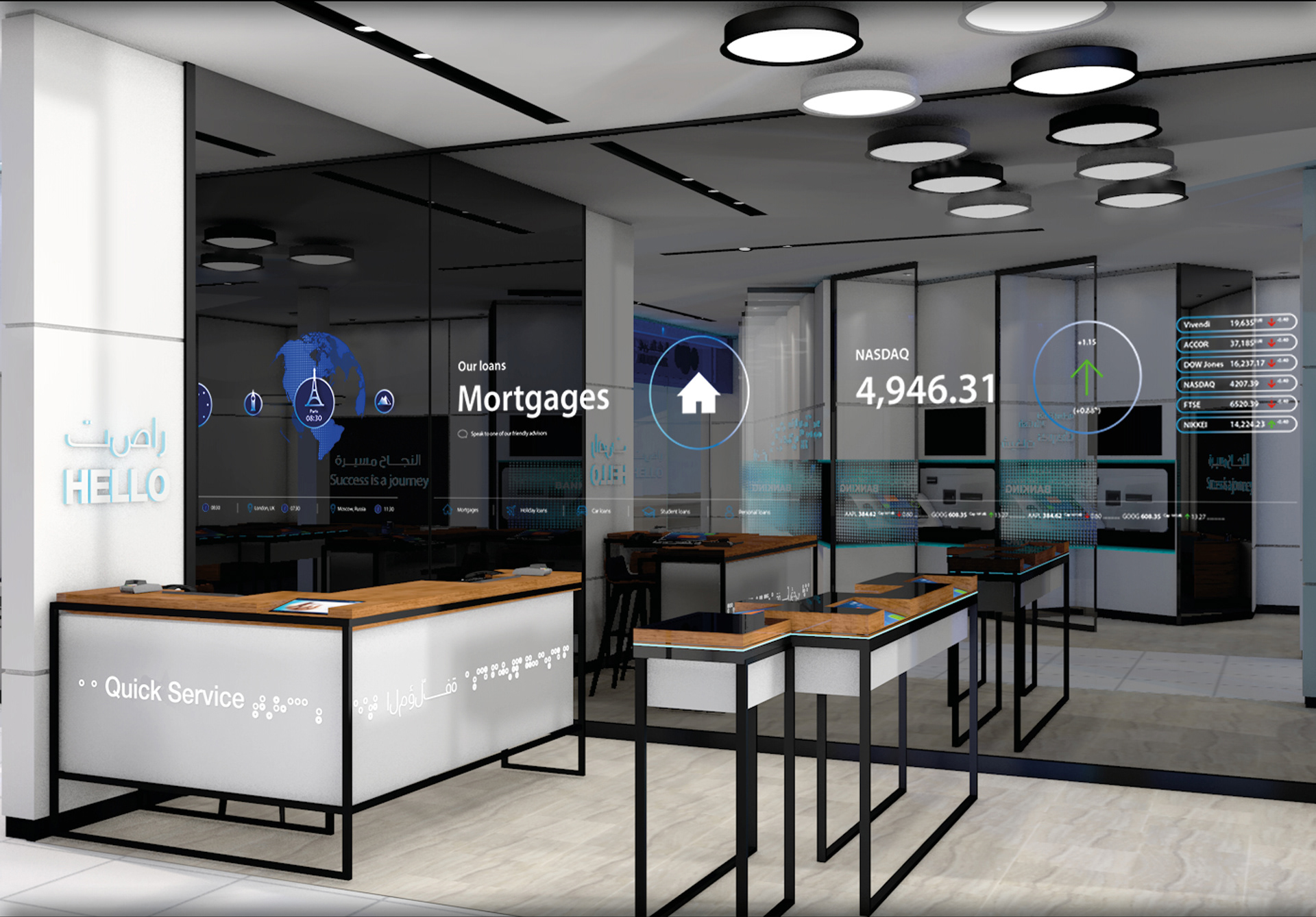 Emirates NBD's vision of the branch of the future centred around a blended approach to banking, combining traditional services with cutting-edge technology and personalised experiences. I created the visual treatment for the environmental graphics, storyboarding and art directing extensive animations and video sequences. These included bespoke screens displaying an animated cityscape transitioning from day to night, digital exhibits demonstrating innovative banking solutions, and advisory services led by customer service representatives and financial advisors.
